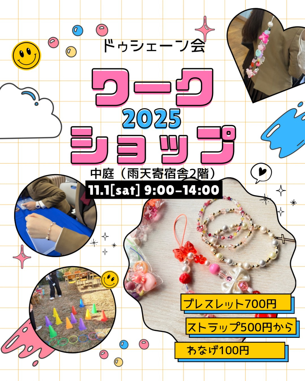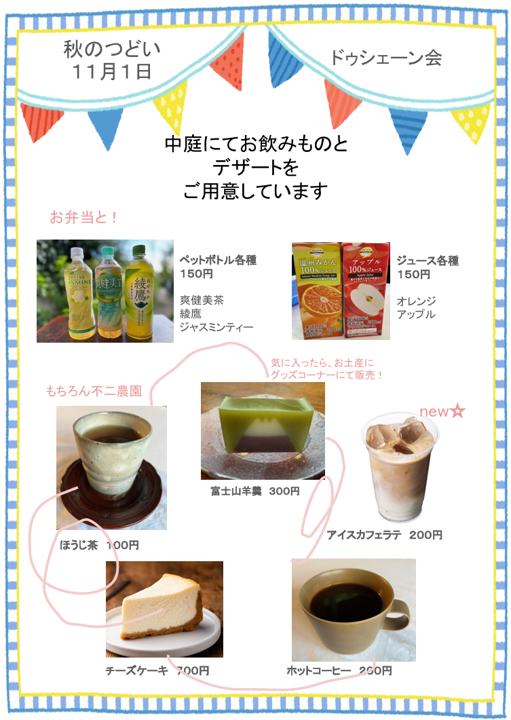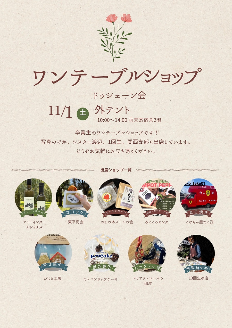 11月1日(土)の「秋のつどい」では、お弁当や飲み物の販売のほか、ドゥシェーン会オリジナルグッズ販売やワークショップもご用意しております。卒業生のワンテーブルショップも多数出展予定です。どうぞお気軽にお立ち寄りください。